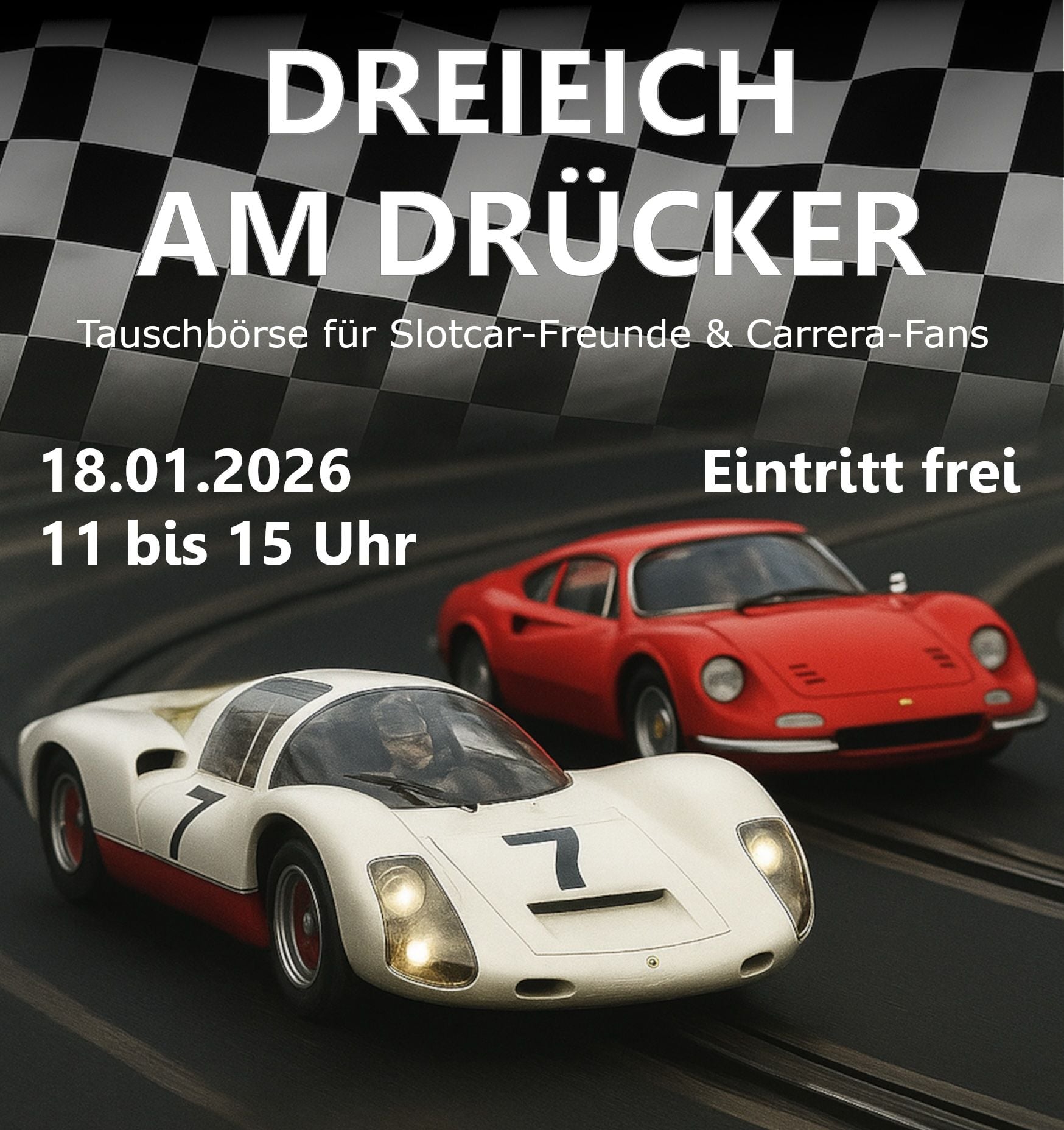 Am 18. Januar 2026 findet zum ersten Mal ein Treffen von Slotcar-Freunden und Carrera-Fahrern in Dreieich statt. Ich heiße Euch herzlich Willkommen auf der Homepage von „Dreieich am Drücker", die Euch das Event näherbringen soll.